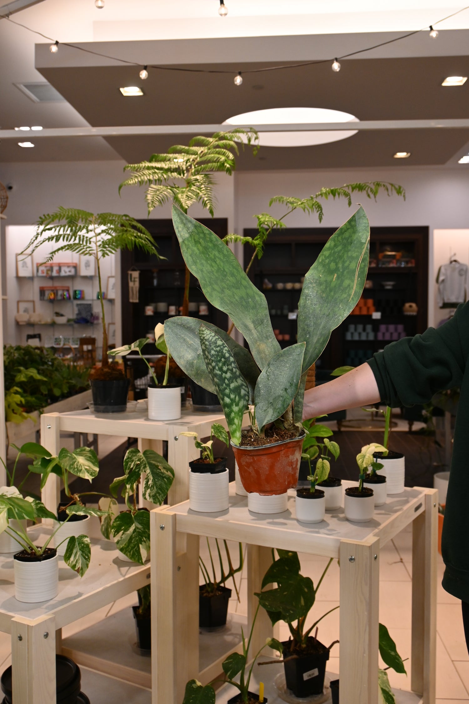 Sansevieria are low-maintenance, and easy-going. They tolerate low light and low humidity. Allow their soil to completely dry out between waterings.